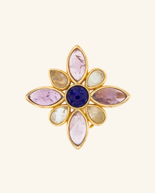 Champagne gold brooch with hand-carved natural stones of amethyst, rutilated quartz and lapis lazuli. A jewel of great harmony and light that will become your favorite.