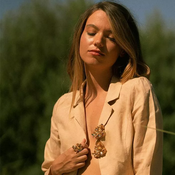 Champagne gold brooch with an elegant and sophisticated design, hand carved to create an exclusive pattern. A jewel inspired by the Posidonia algae, a unique species of the Mediterranean Sea, being the refuge of thousands of species that inhabit its meadows.