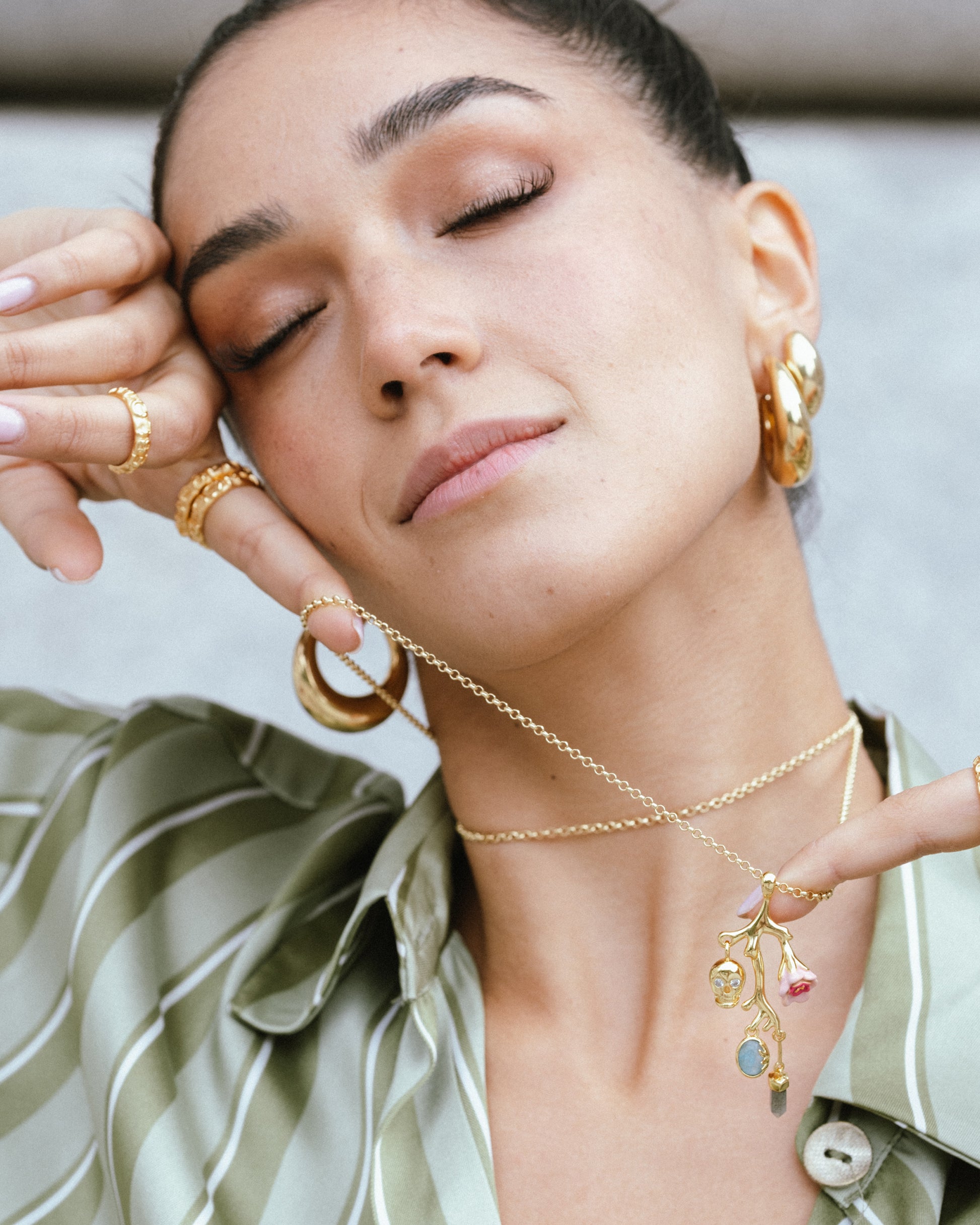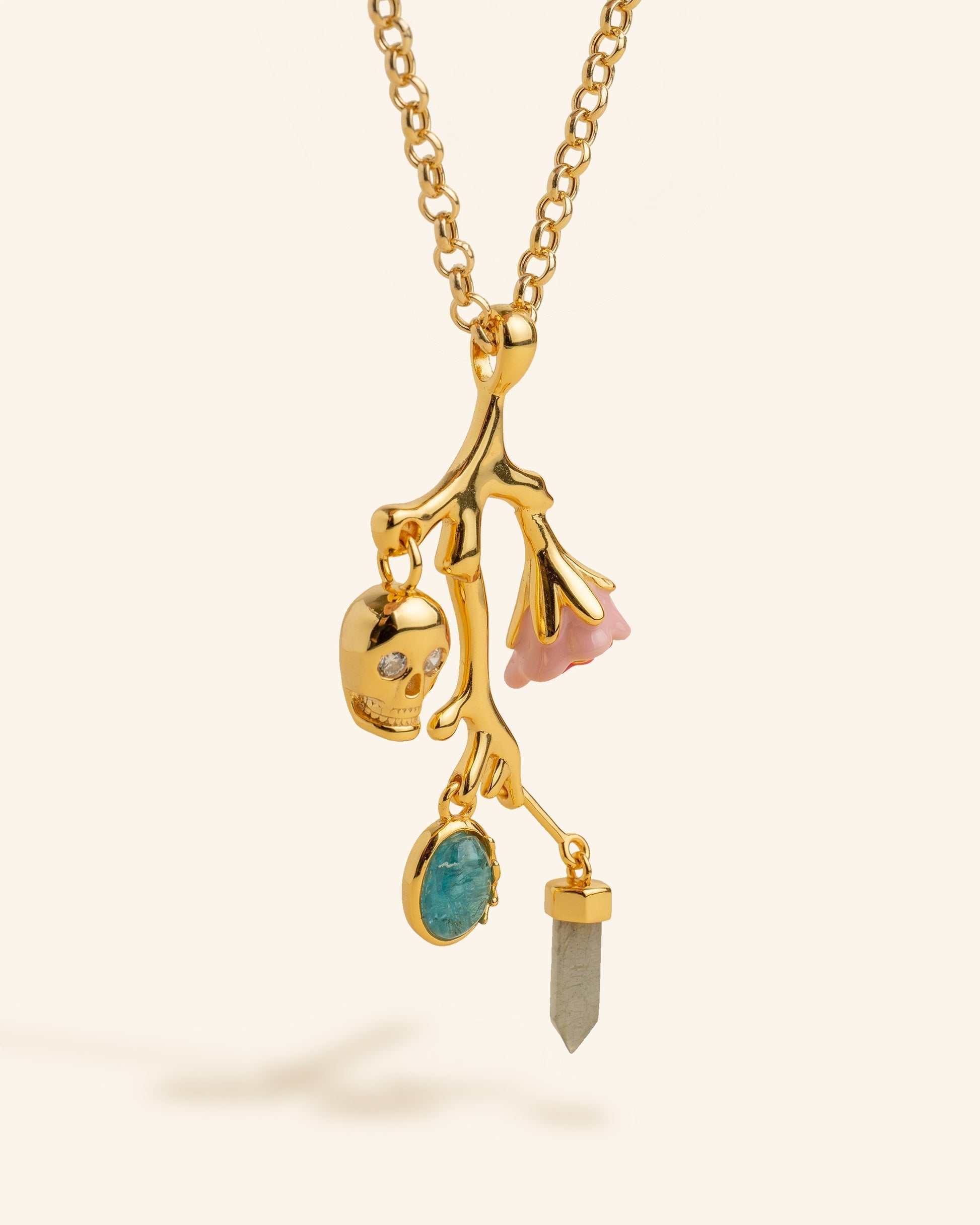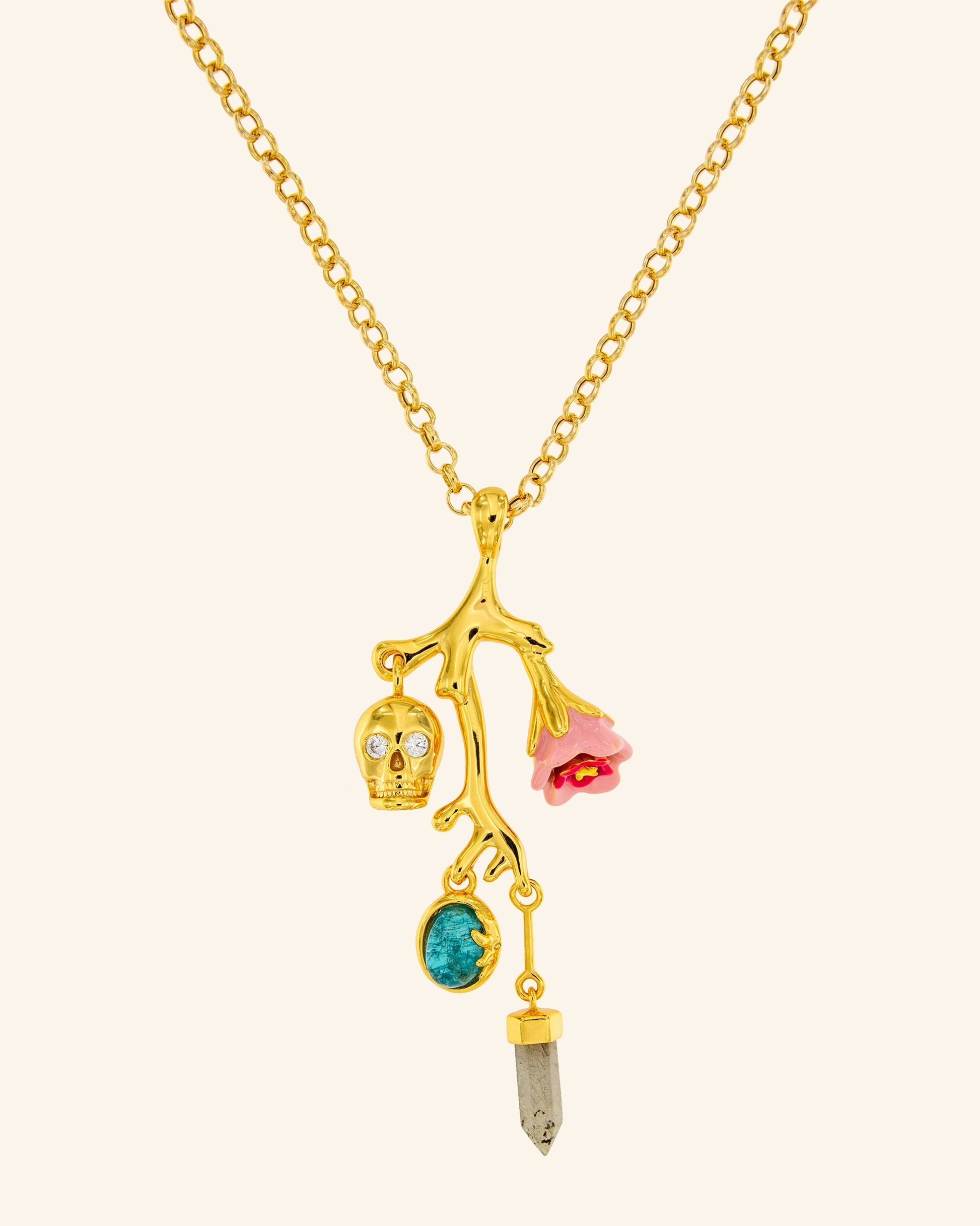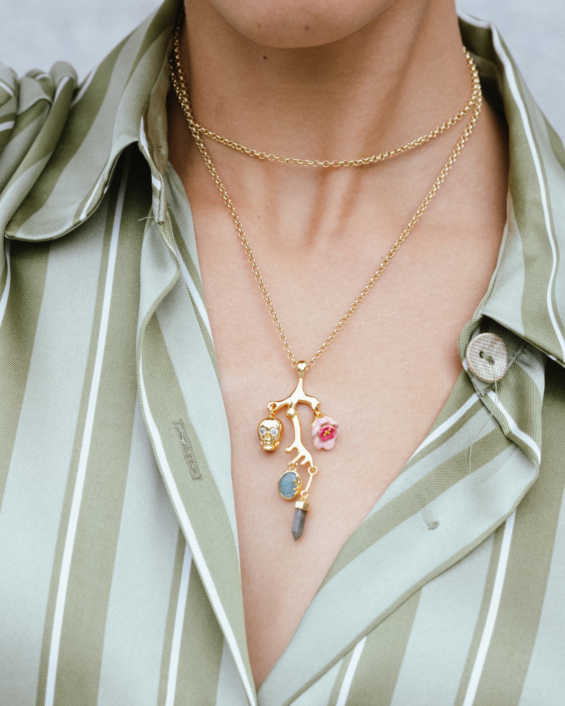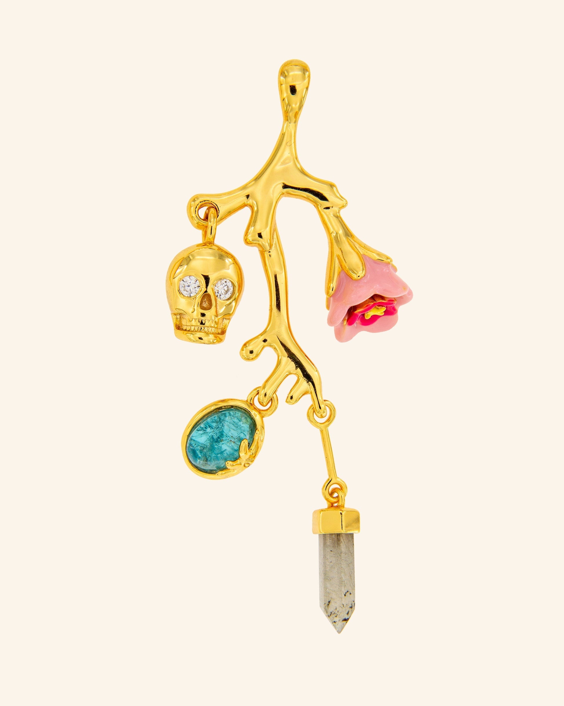 925 ms silver plated in champagne gold with labradorite, apatite, zircons and enamel.