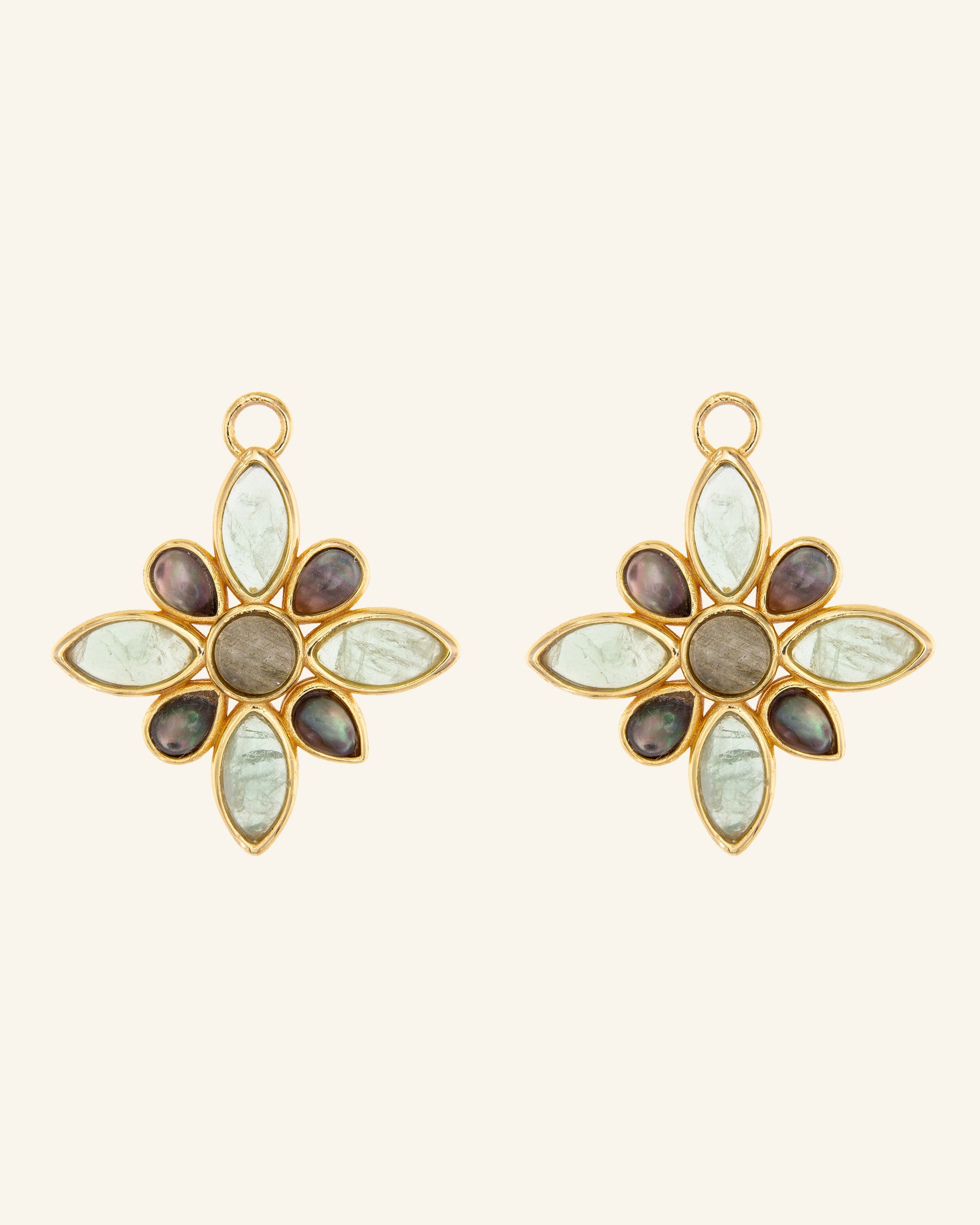 Earring pendants in champagne gold and natural stones creating floral designs inspired by flowers. With its petals in vibrant tones, it is a spring and cheerful jewel that reminds us of sunny days.