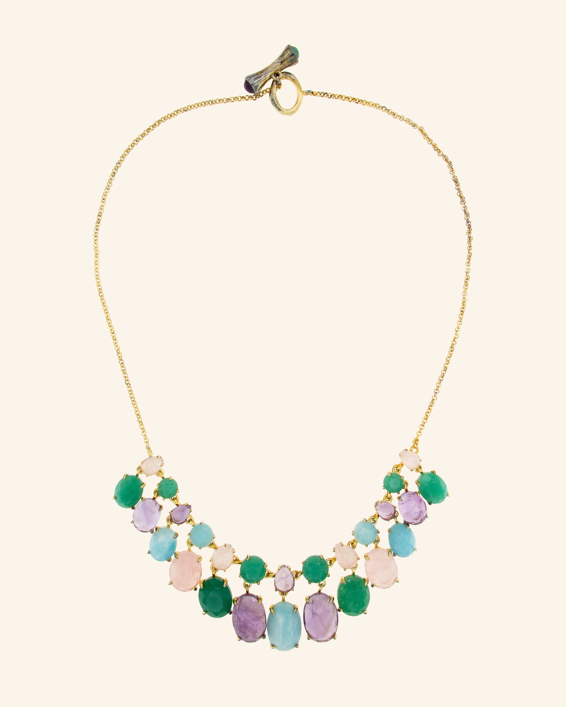 Necklace in champagne gold and natural stones in different tones creating a cheerful and elegant jewel inspired by the natural beauty of minerals and their colors. An elegant and original jewel that will accompany you to your most special events.