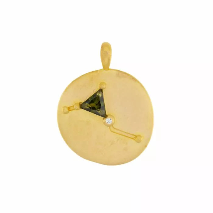 Medal in champagne gold, hand engraved with details in natural stones and zircons representing the constellation of the zodiac sign Cancer. Although it does not have bright stars per se, Altarf is one of the most visible, serving as inspiration for this jewel. Combinable with both chain and leather for a more casual look.