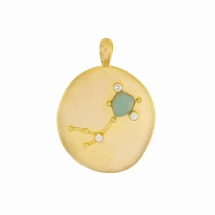 Medal in champagne gold, hand engraved with details in natural stones and zircons representing the constellation of the zodiac sign Virgo. The Spike star being its brightest star, it inspires us to create a unique jewel full of light. Combinable with both chain and leather for a more casual look.