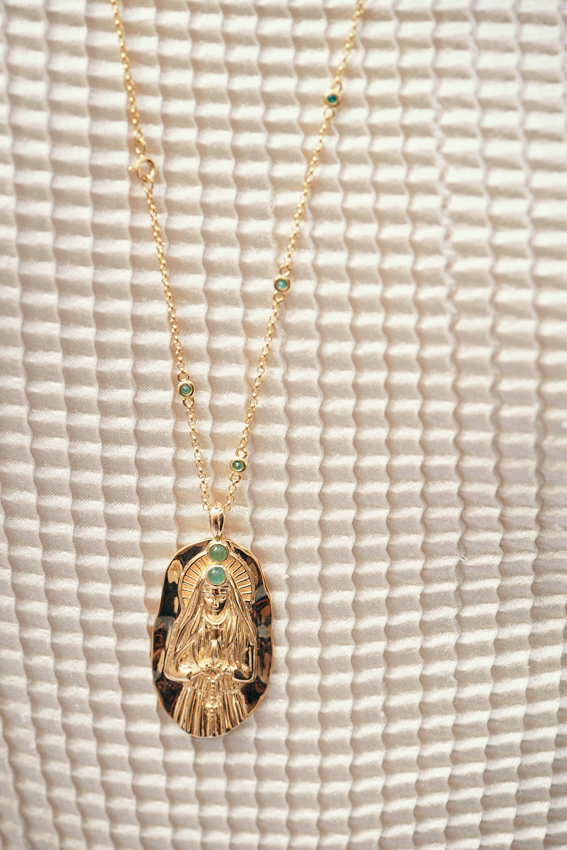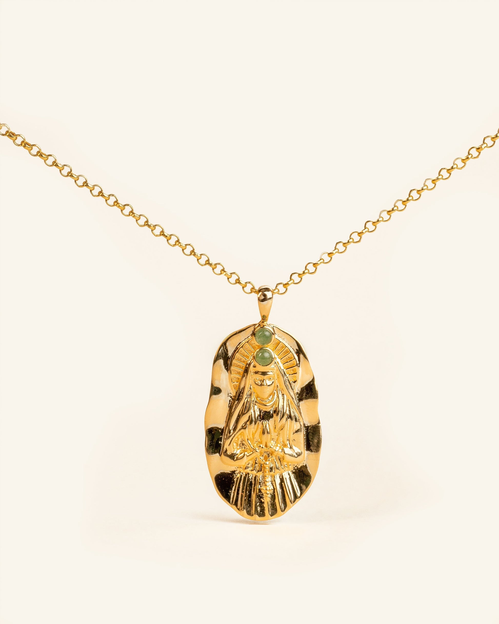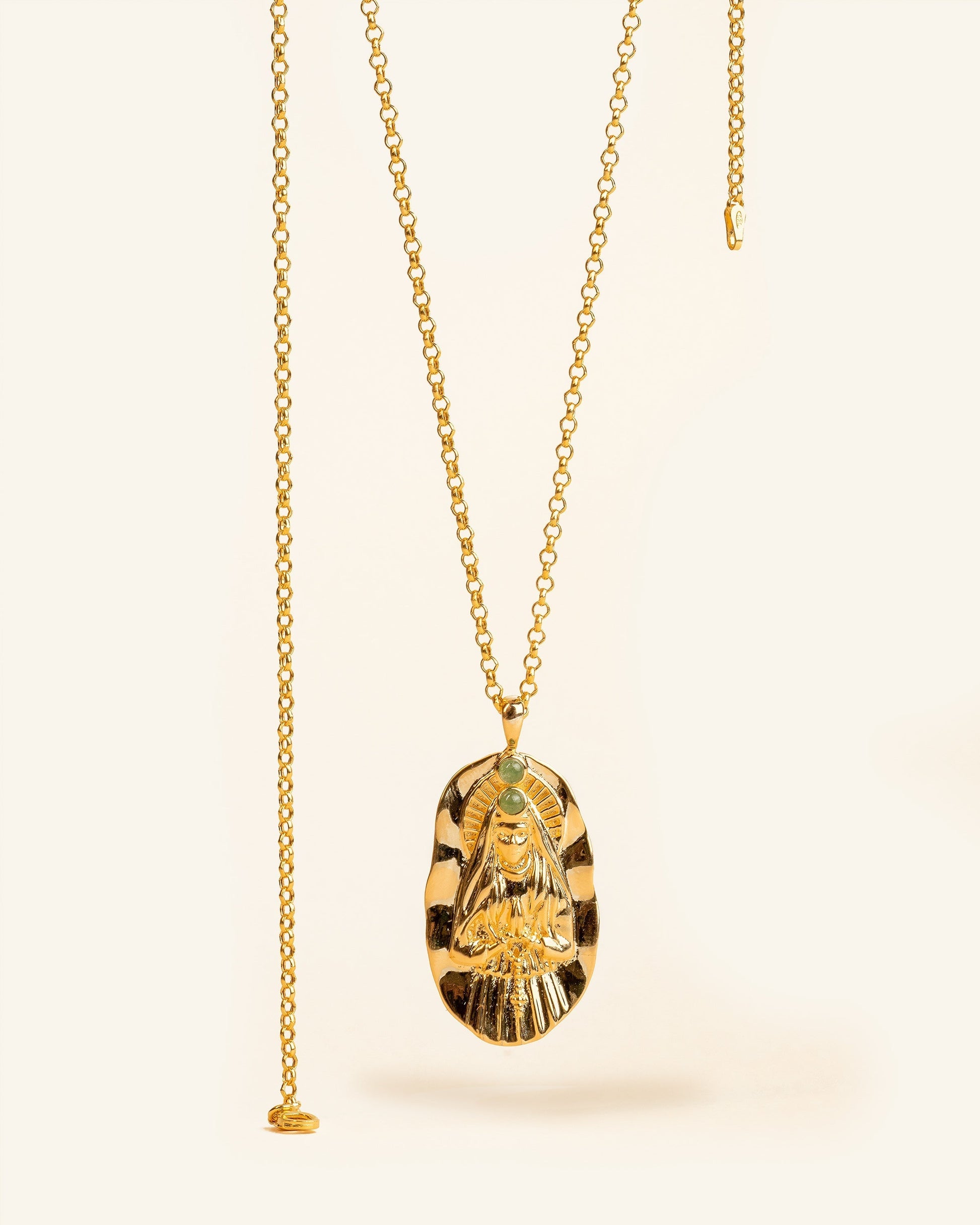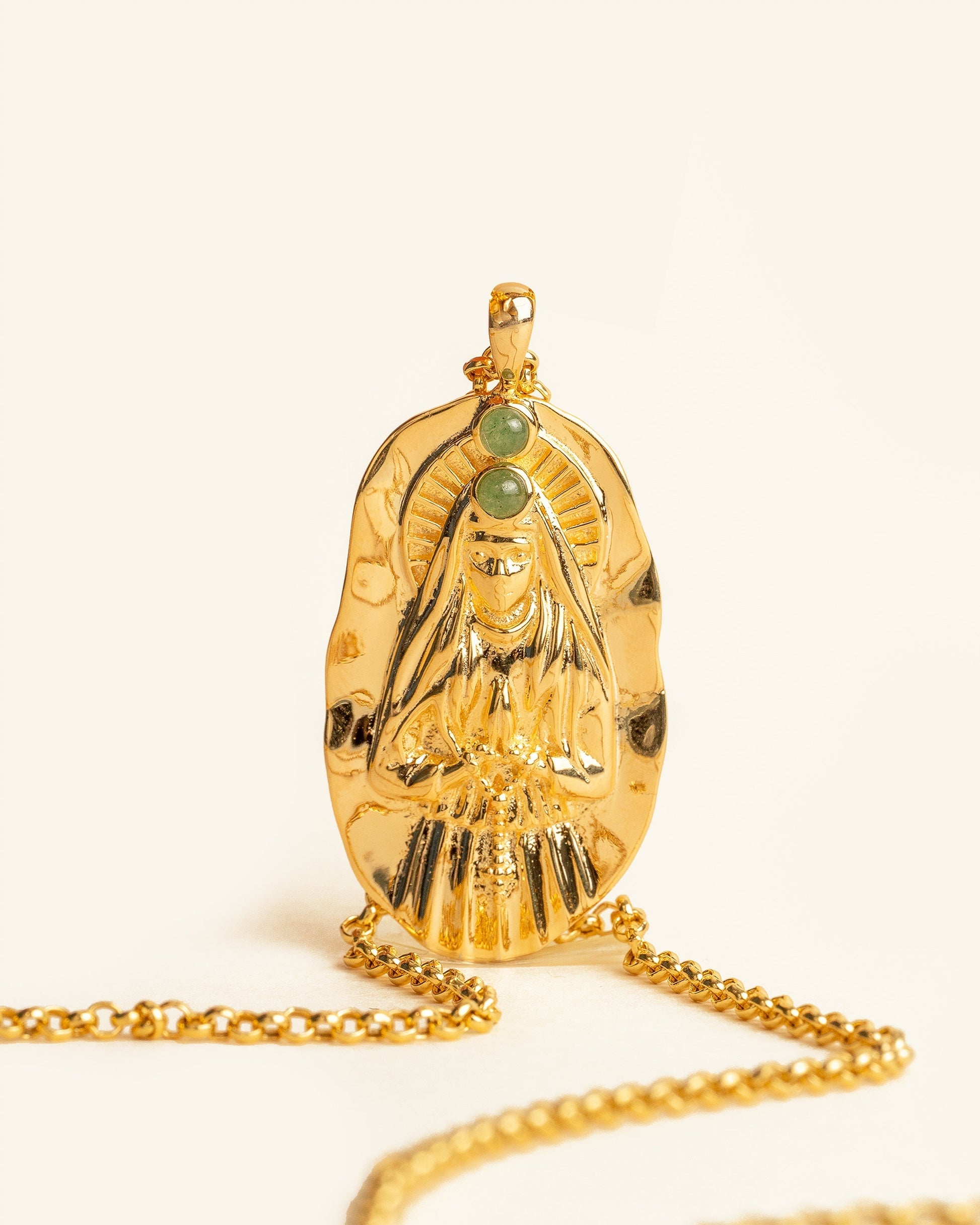 Champagne gold medal of the Virgin Mariana or Virgin of the Miracles of Mary with two carved aventurine stones, and with a smooth reverse to engrave messages. For those fascinated by this virgin and everything she represents and those who believe in miracles, an amulet that will help you gain the strength and perseverance to make them happen and will witness all your battles and triumphs.
