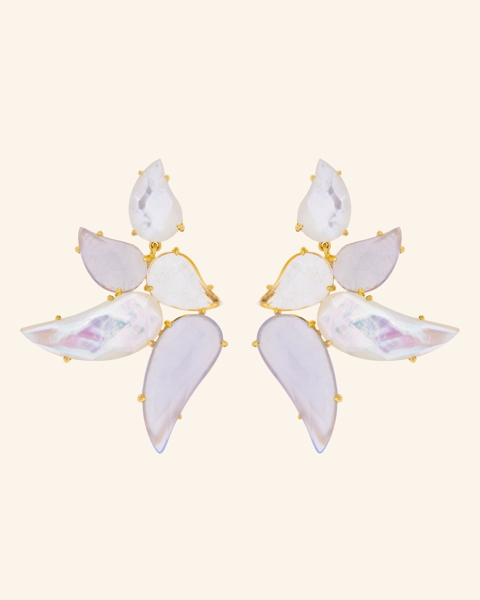 925 ms silver plated in champagne gold, colorless Quartz, Chalcedony and 100% natural white Mother of Pearl.