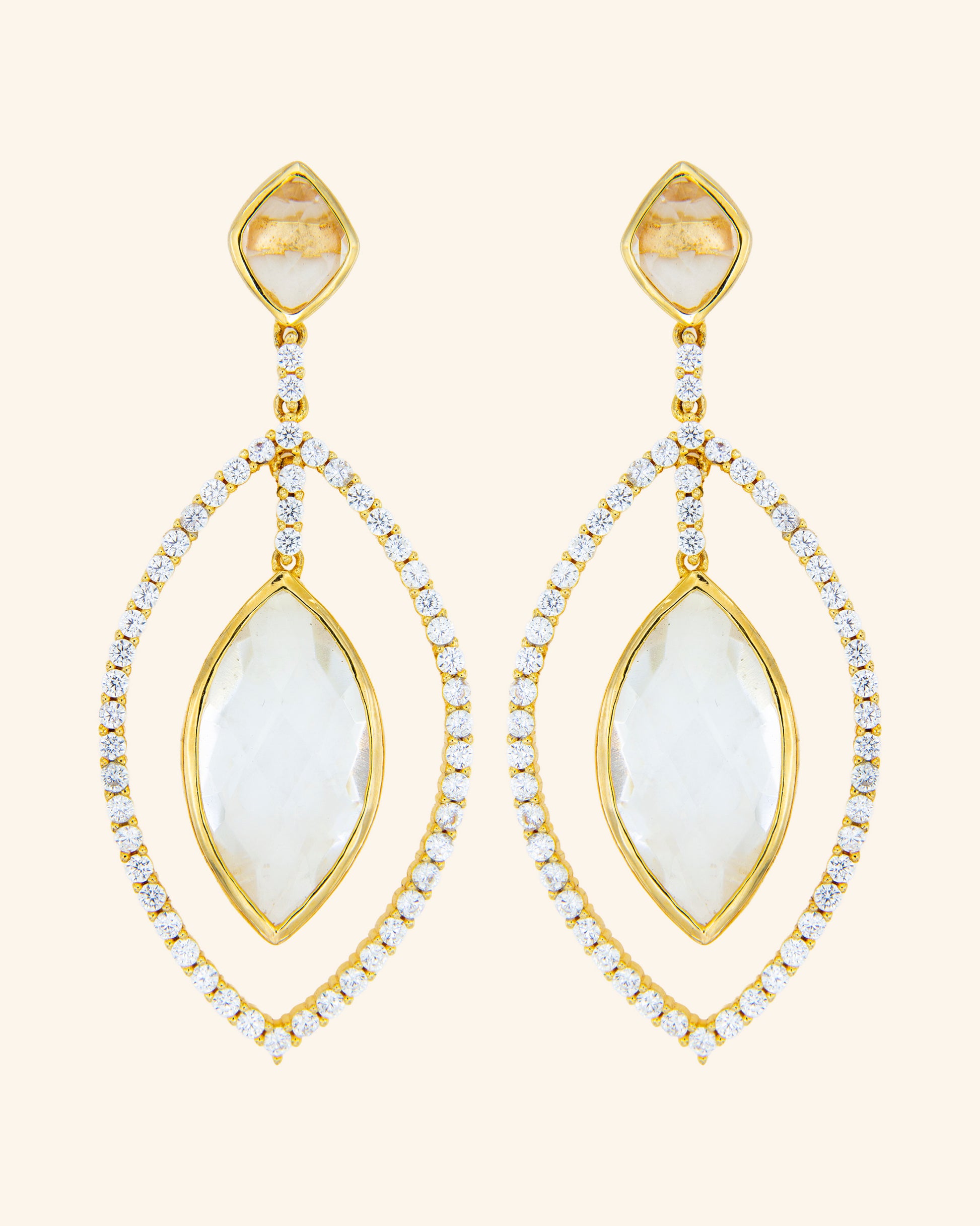 Champagne gold earrings with hand-carved natural stones and zircon details that surround the stone carved in the shape of an eye, creating a jewel full of movement and with a unique design.