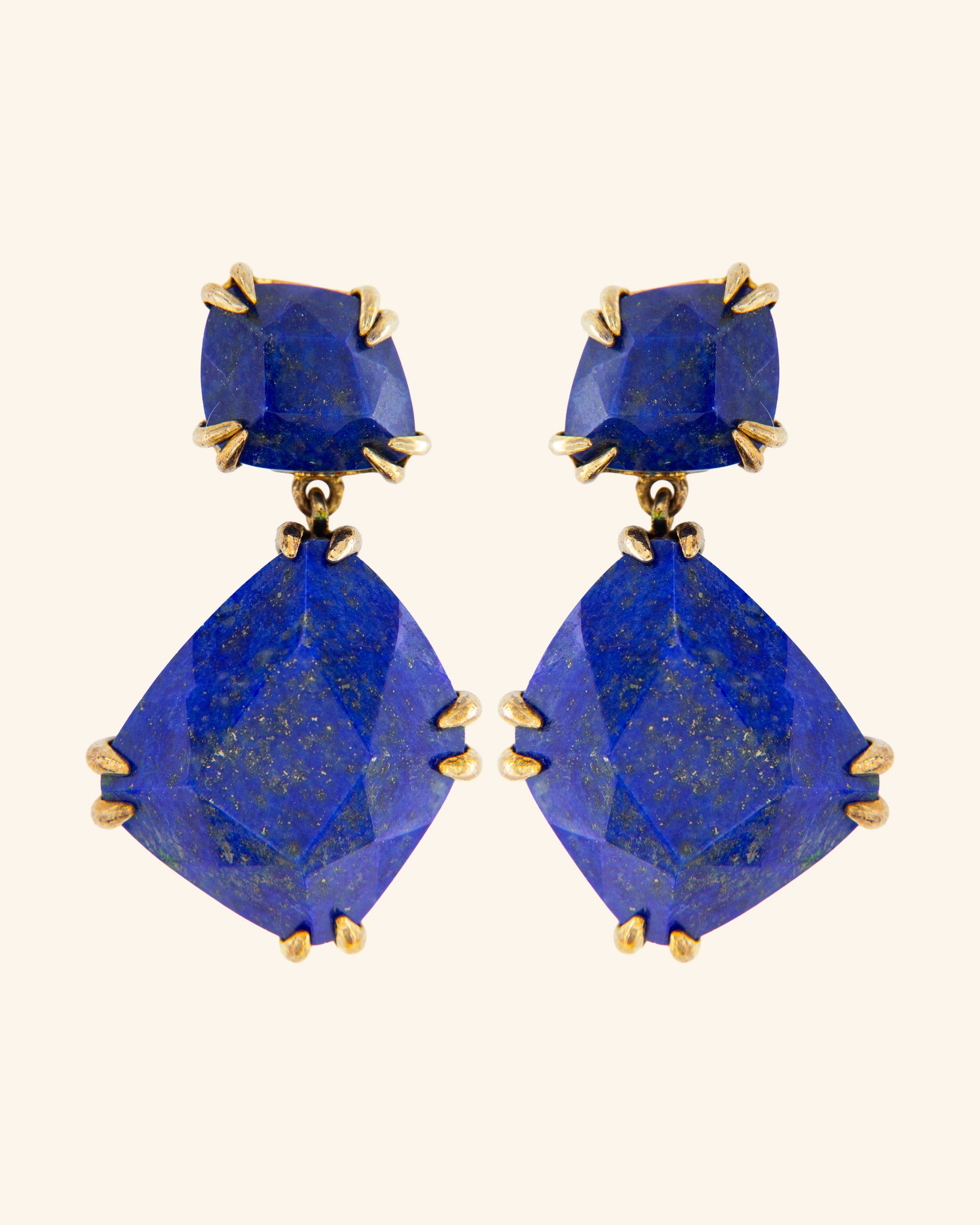 Earrings in champagne gold and hand-carved natural stones in irregular shapes and deep blue tones that transport us to the island in Oceania that gives its name to this jewel. An elegant and original piece that will be the center of attention.