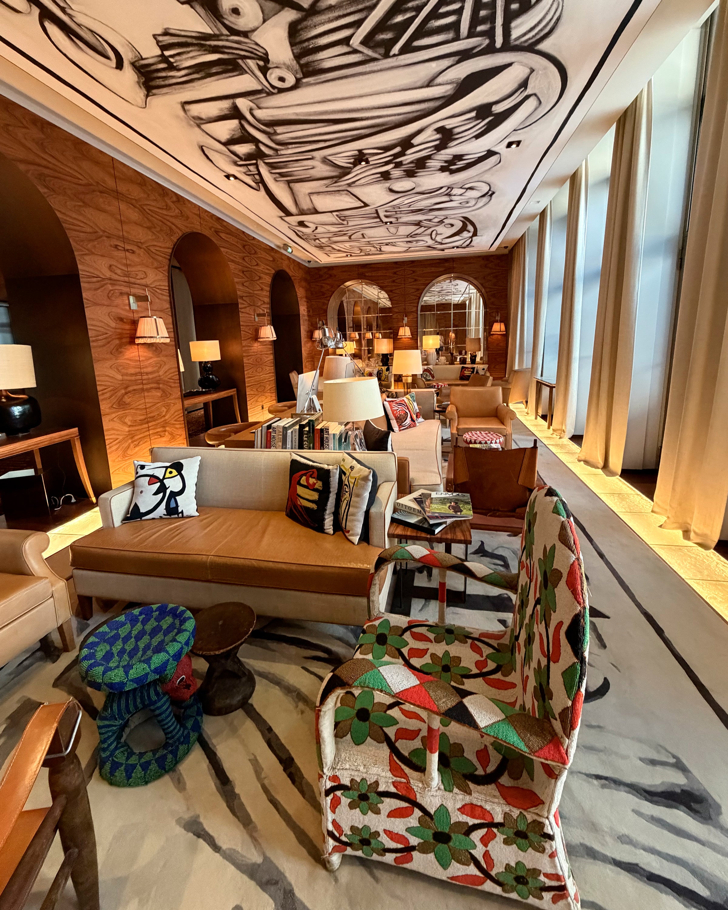 Es el trabajo del diseñador Philippe Starck, quien firmó cada rincón del hotel con su inconfundible mezcla de referencias. La decoración es un viaje en sí misma: influencias asiáticas y africanasconviven con materiales naturales cálidos —maderas oscuras, mármoles, tejidos de textura rica— y una colección de arte que puebla cada superficie. Cuadros, esculturas, fotografías, objetos curiosos. Parece la casa de alguien con muy buen gusto y muchas historias que contar. Cada pasillo, cada sala tiene algo que mirar.