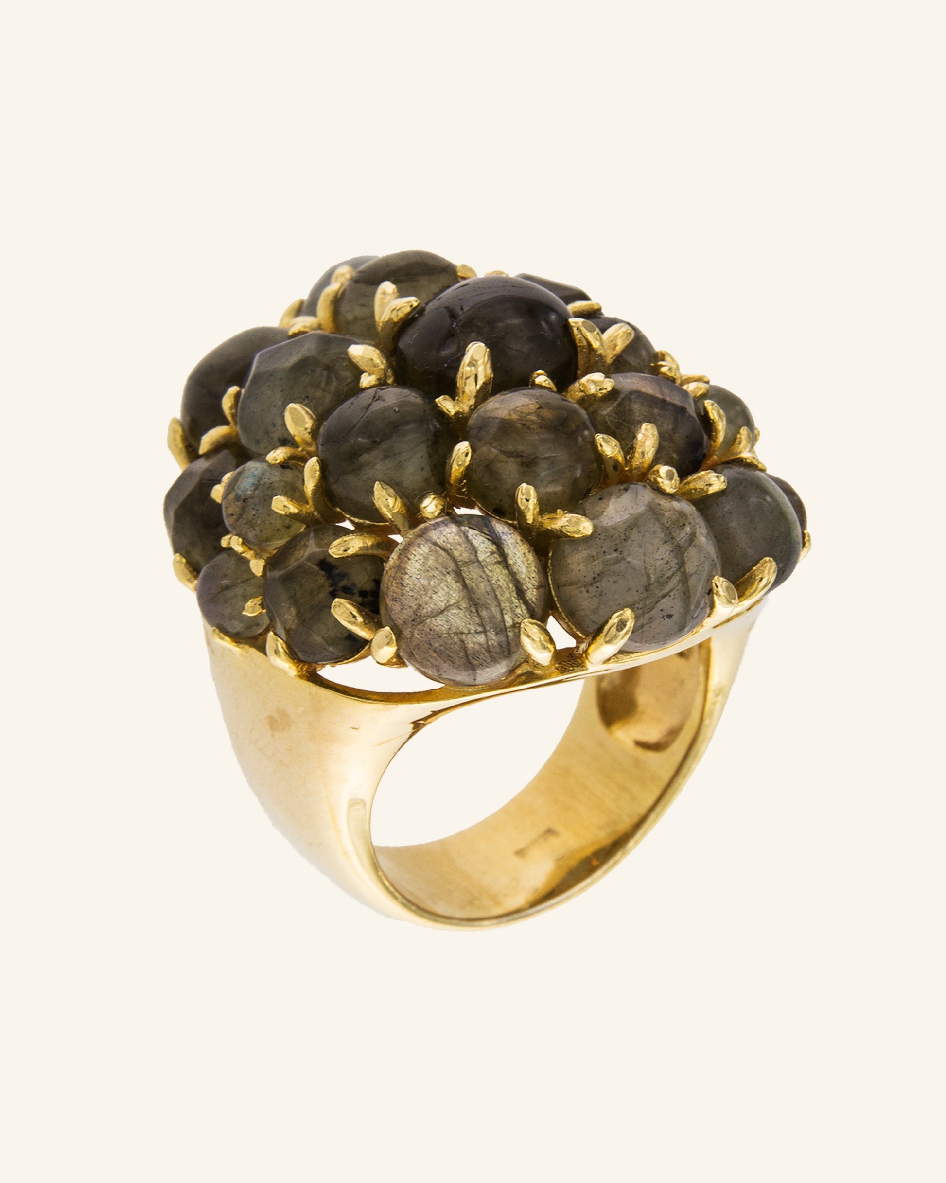Anillo en oro champán y piedras naturales talladas a mano en formas redondas para crear una joya única y exclusivo, tanto por su luz como por su diseño. Una joya espectacular que no pasará desapercibida y que te acompañará a todos tus planes.