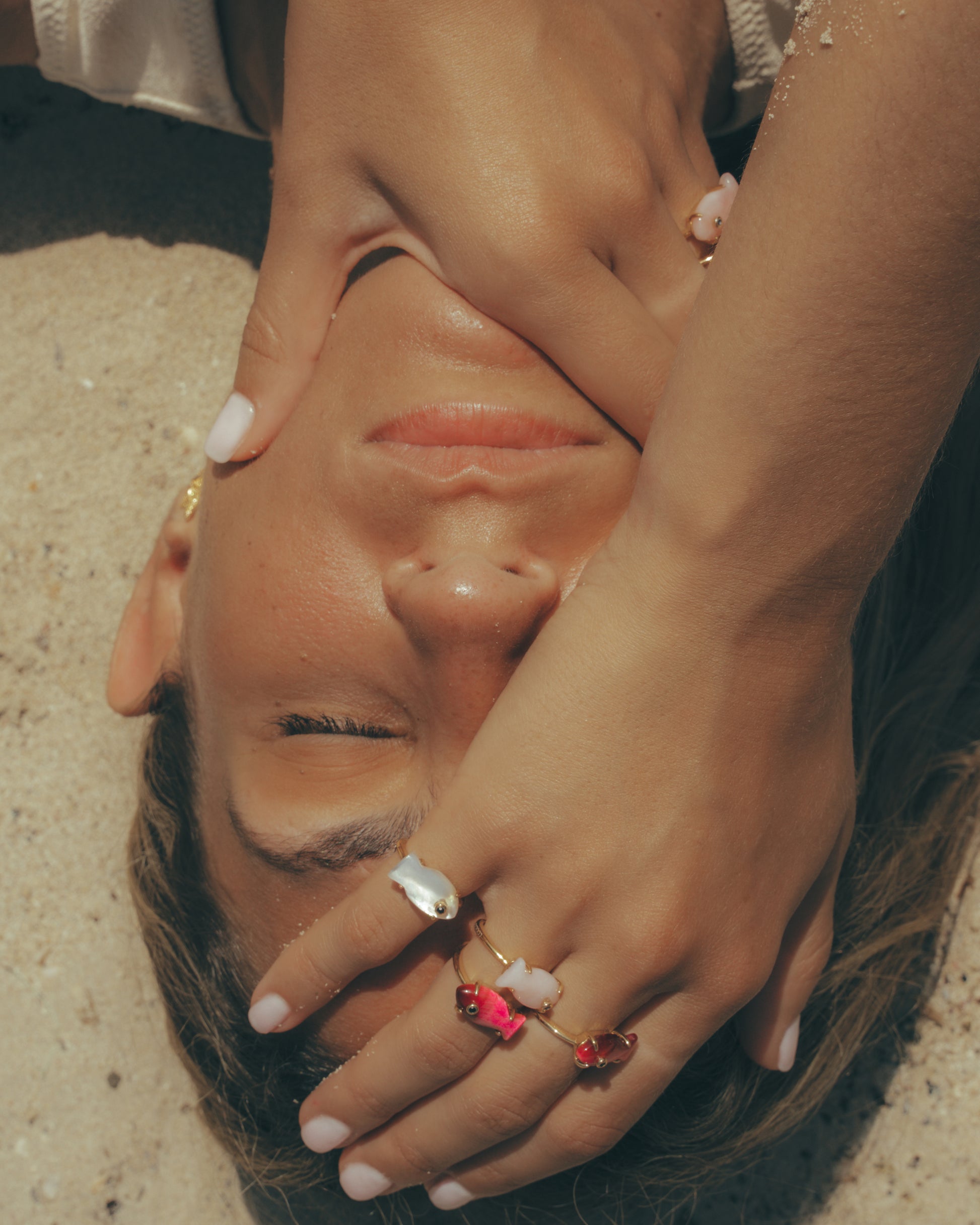 Anillo fino en oro champán y piedra natural tallada a mano en forma de pez con detalle en circonita.