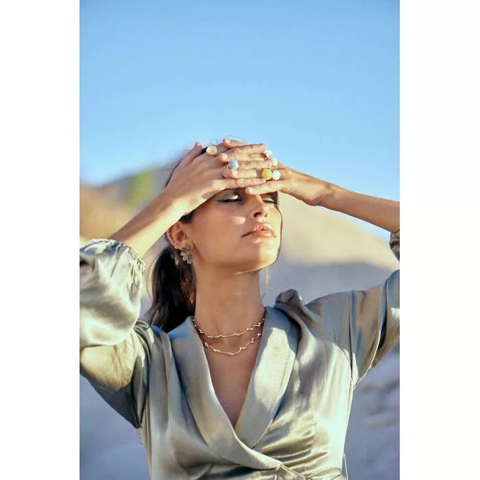 Anillo fino en oro champán y ónix blanco tallado a mano, con tonos vibrantes y formas irregulares. Una joya que por su versatilidad y comodidad se ha convertido clásico Coolook perfecto para aportar luz y color a todos tus looks, que además podrás combinar en otros colores.