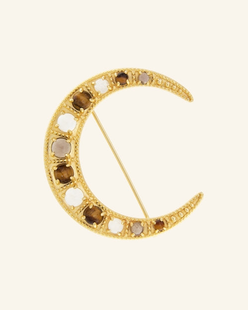 Broche en oro champán con diseño de luna y detalles en Ojo de Tigre y otras piedras talladas a mano. Tanto por su diseño único como por sus acabados de alta joyería lo convierte en una de las piezas claves de esta colección.