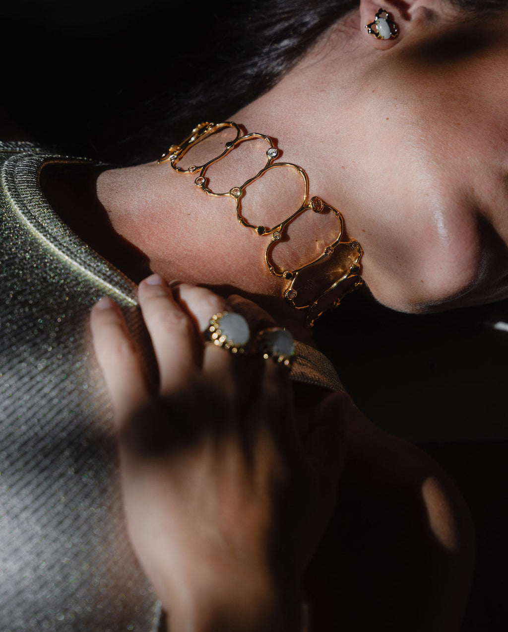 El estilo bohemian chic está presente en el diseño de este espectacular choker realizado a mano. La estudiada gama de color de sus circonitas está inspirada en la sagrada campiña de Misiones de Paraguay, donde las puestas de sol inciden en el agua creando reflejos ondulados espectaculares. Una joya que marca las celebraciones y eventos con más estilo.