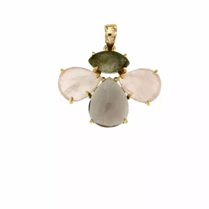 Colgante en oro champán y piedras naturales talladas a mano en forma de abeja, combinando distintos tonos para crear una pieza original y especial. Combinable tanto con cadena como con nuestros cordones de cuero, aportará alegría y color a todos tus looks.