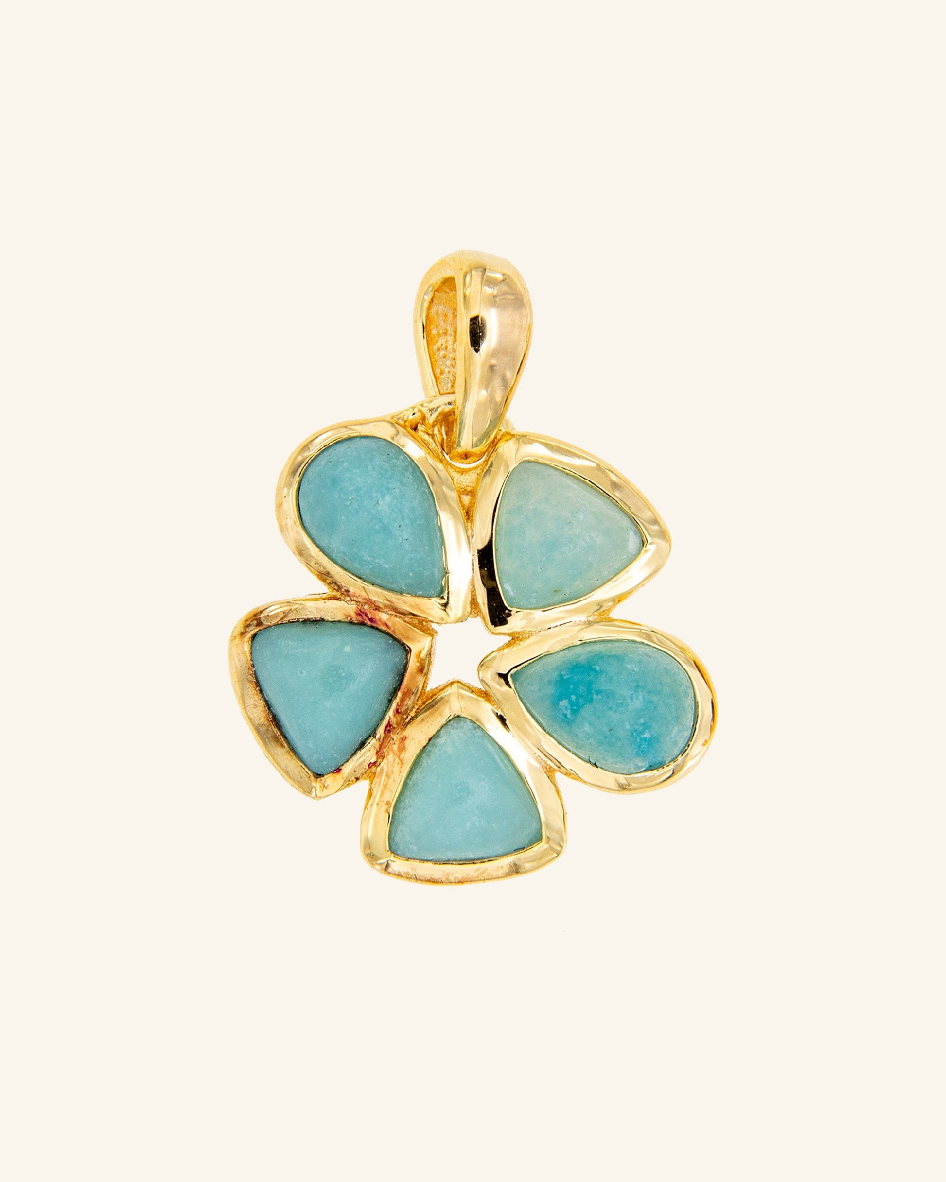 Colgante con bisel en oro champán y piedras naturales talladas a mano con con diseños florales inspirados en la flor tropical del hibisco. Una pieza llena de brillo para no olvidar los días primaverales y acompañarte a todos tus planes combinándolo con nuestras cadenas.