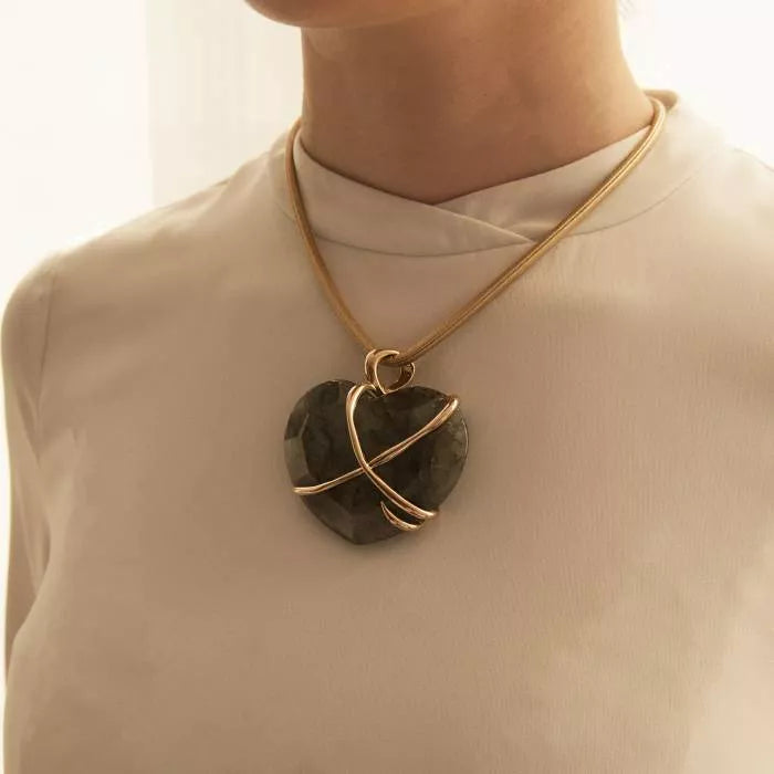 Colgante en piedra natural tallada a mano en forma de corazón con detalles en oro champán como el cordón dorados que rodea el mineral. Su tamaño lo convierte en la pieza perfecta para combinar con una cadena larga o con nuestros cordones de cuero.
