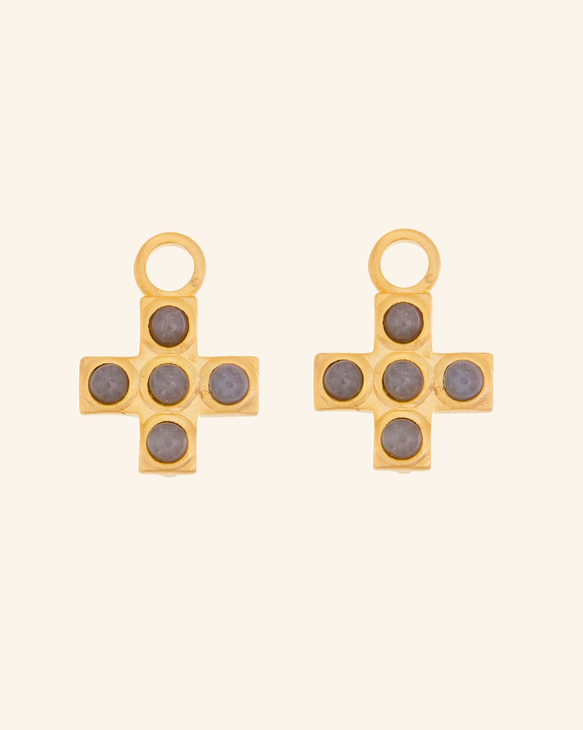 Colgantes para pendientes en oro champán y piedras naturales talladas a mano, con diseños inspirados en cruces bizantinas. Una pieza que mezcla características modernas y clásicas, para crear combinaciones MyCoolook únicas y personales, con un toque de luz y color.