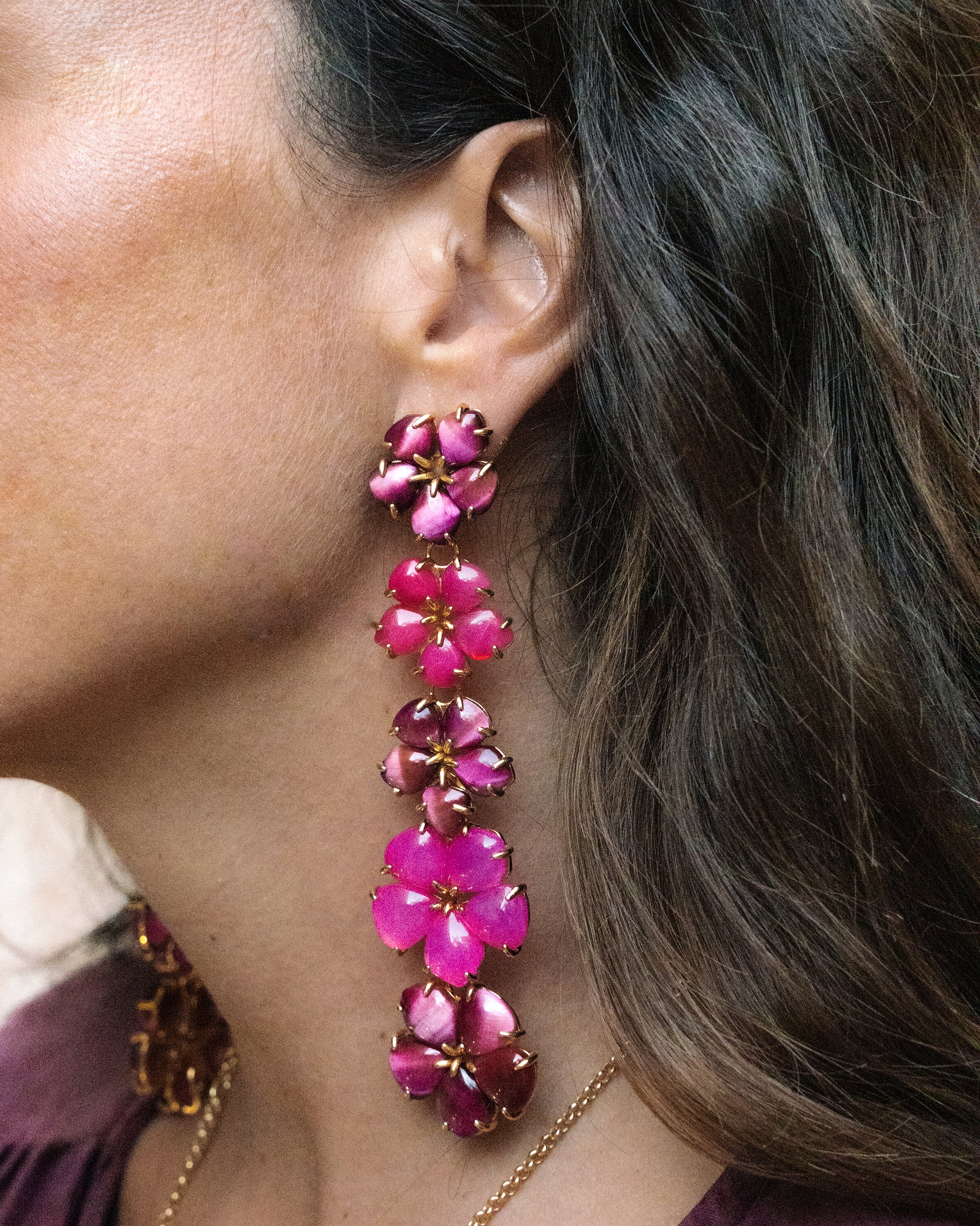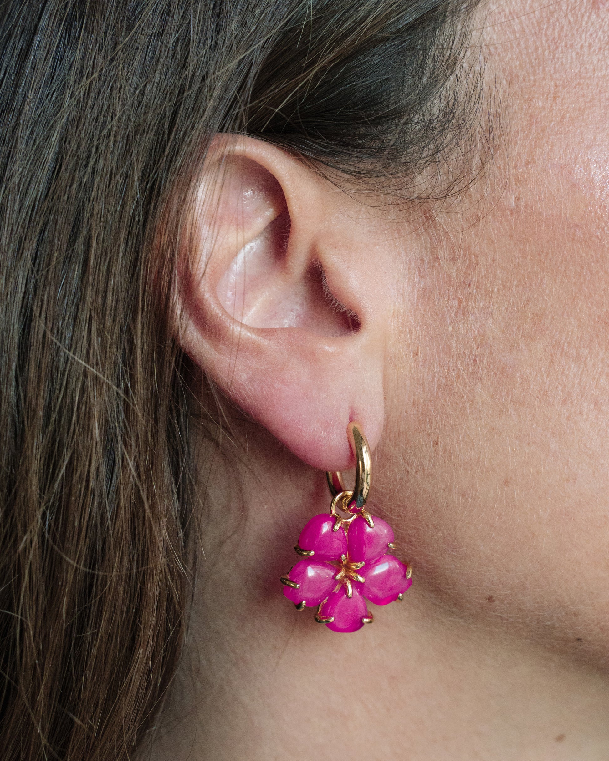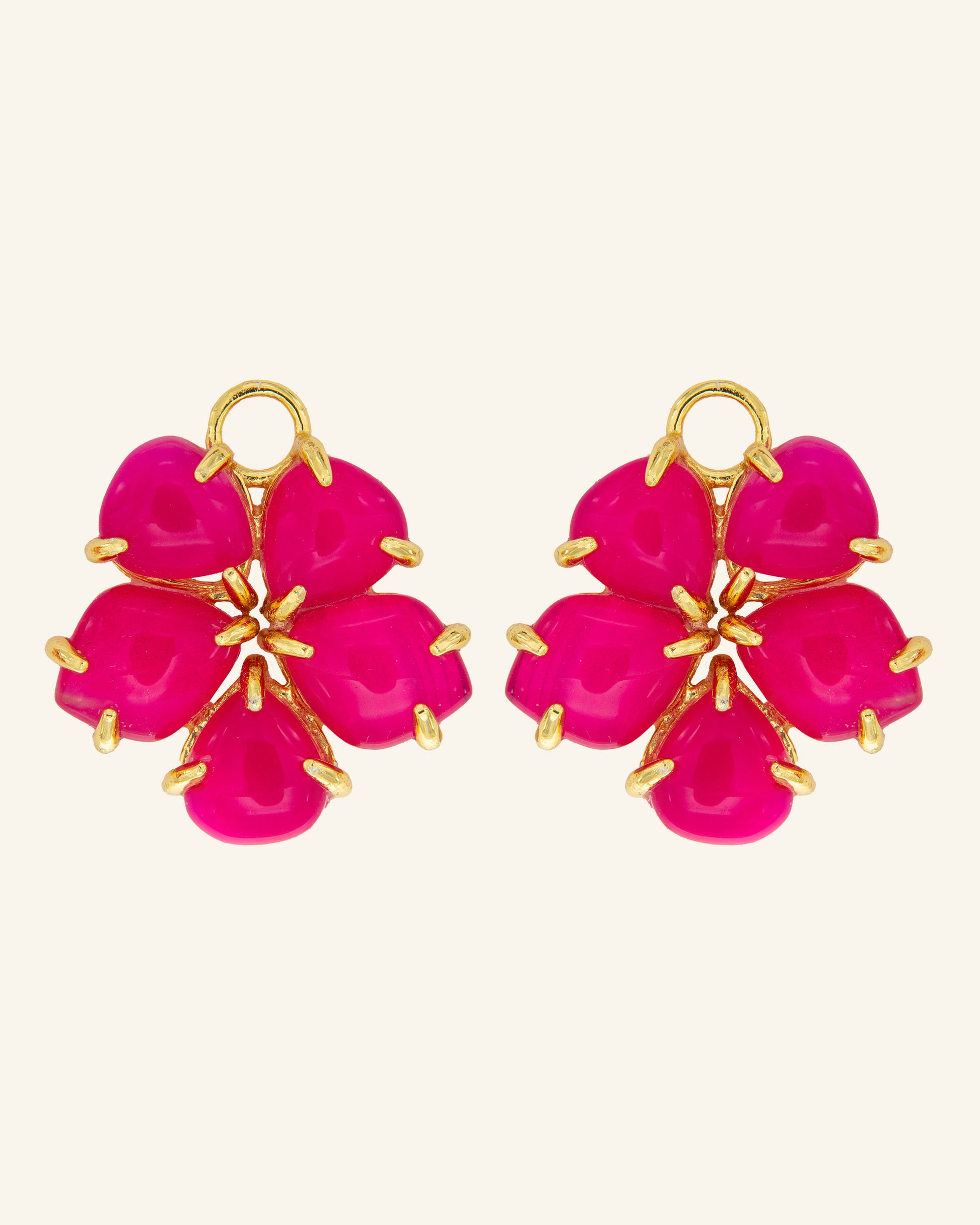 Colgantes intermedios para pendientes en ágata frambuesa tallados a mano encajando pétalo a pétalo hasta formar la flor del hibisco. El resultado son flores irregulares muy alegres y versátiles que pueden llevarse colgando de unos simples aritos, o pendientes o combinarlas con más colgantes para crear la joya floral más chic.