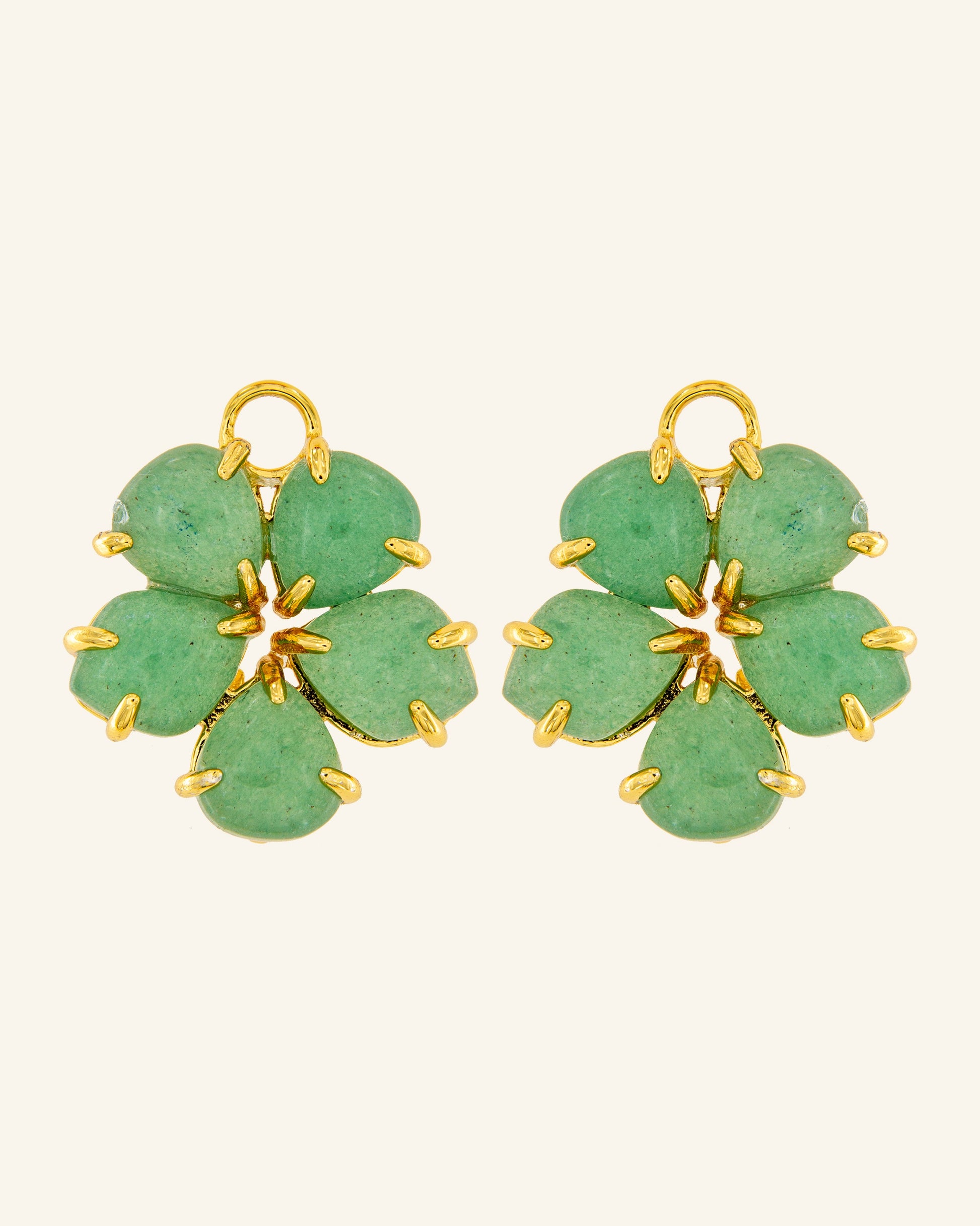 Colgantes intermedios para pendientes en aventurina tallados a mano encajando pétalo a pétalo hasta formar la flor del hibisco. El resultado son flores irregulares, muy refrescantes y elegantes que pueden llevarse colgando de unos simples aritos, o pendientes o combinarlas con más colgantes para crear la joya floral perfecta.