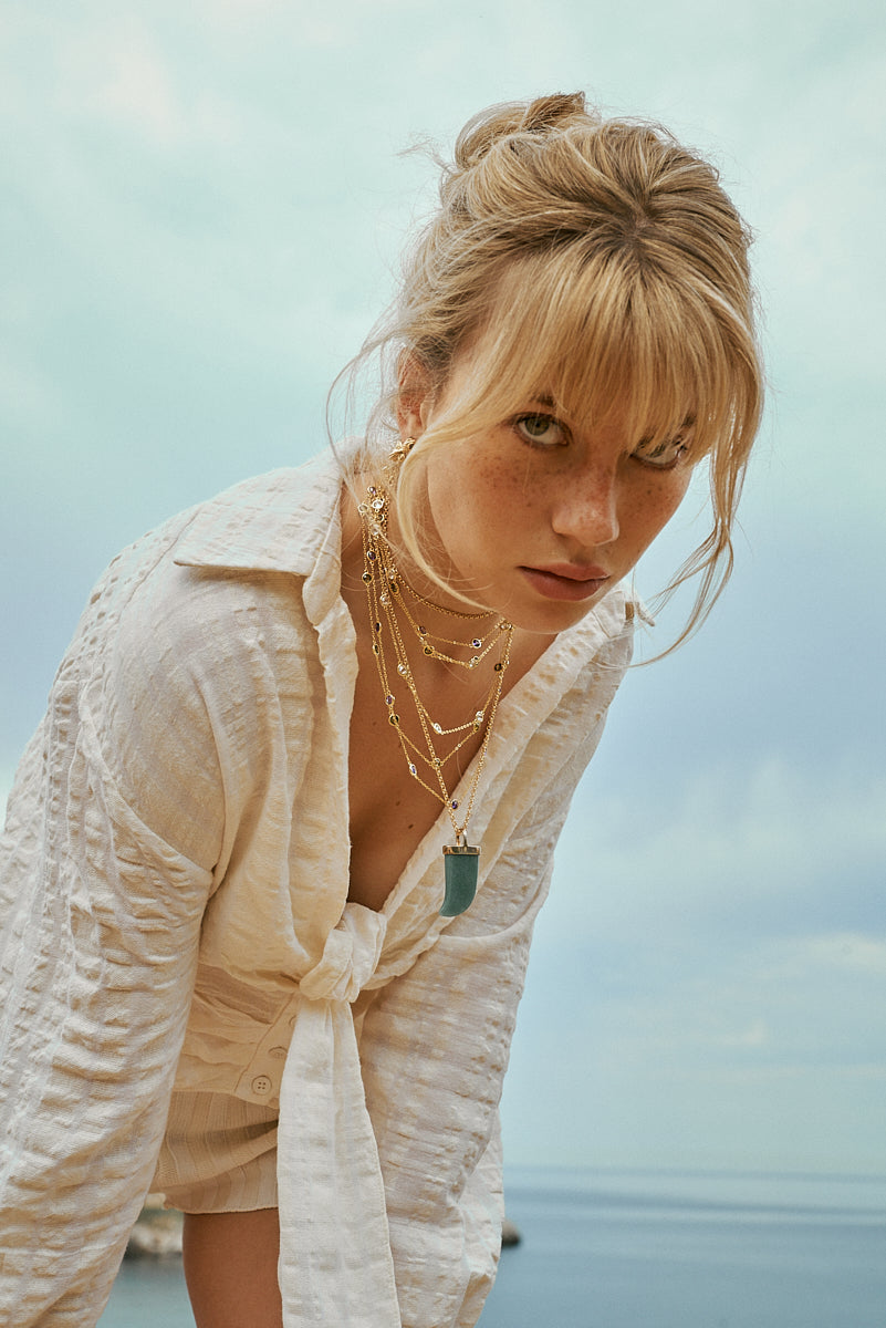 Collar en oro champán con cadena fina y circonitas, representando así la constelación del mismo nombre y sus brillantes estrellas que recorren el cielo nocturno. Una joya cómoda a la vez que elegante que hará de tus looks más sencillos los más especiales, llenándolos de luz.