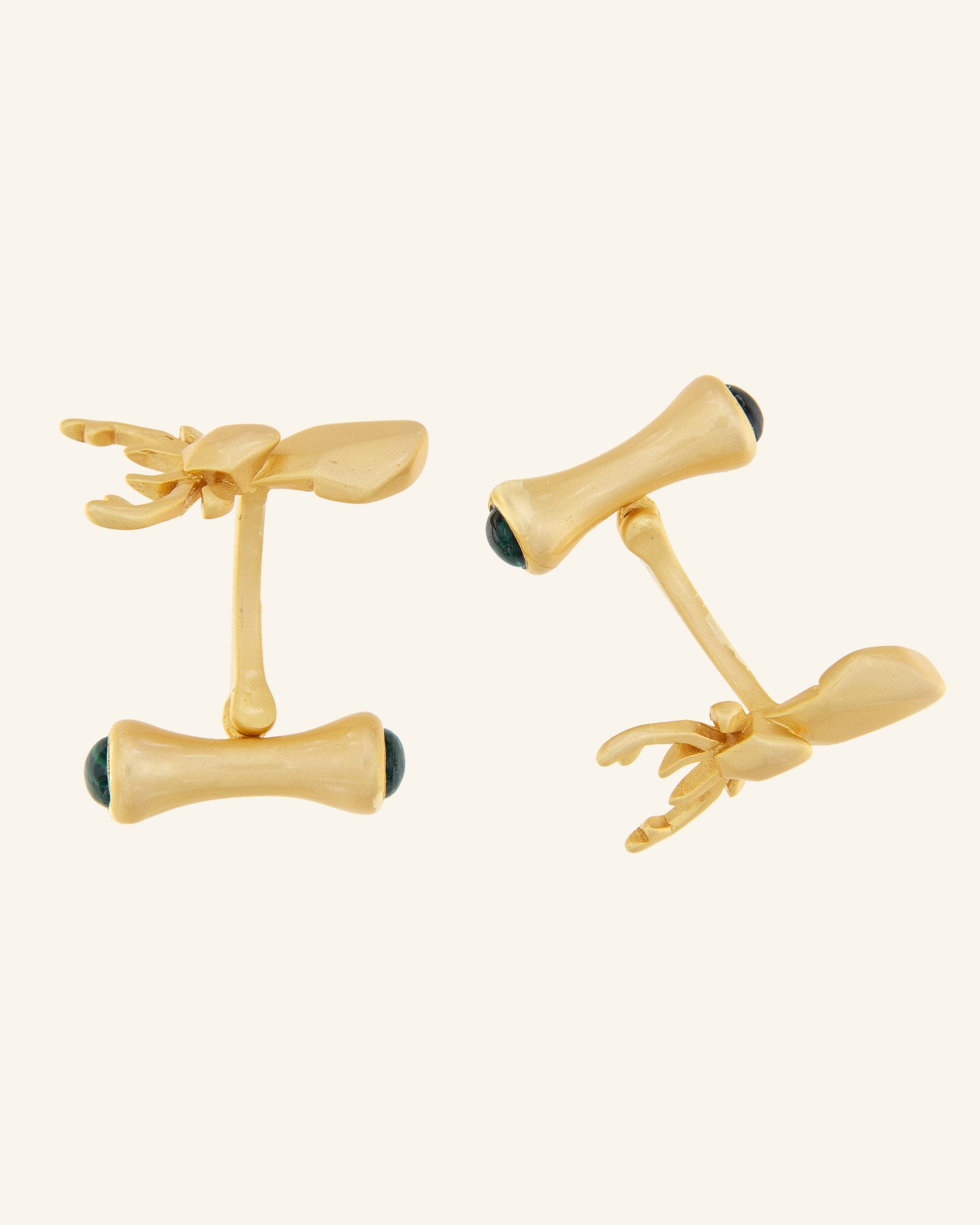 Gemelos de plata con baño de oro mate con diseño de ciervo y detalles en malaquita natural tallada a mano para dar un toque de color.