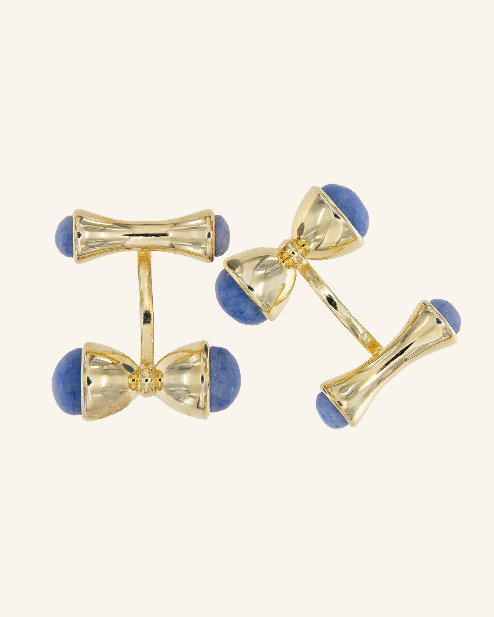 Gemelos en oro champán y piedras naturales talladas a mano en tonos azules para dar un toque de luz y color a la pieza. Con un diseño inspirado en los relojes de arena, esta pieza única se convertirá en tu mejor compañera para completar tu estilo más serio.