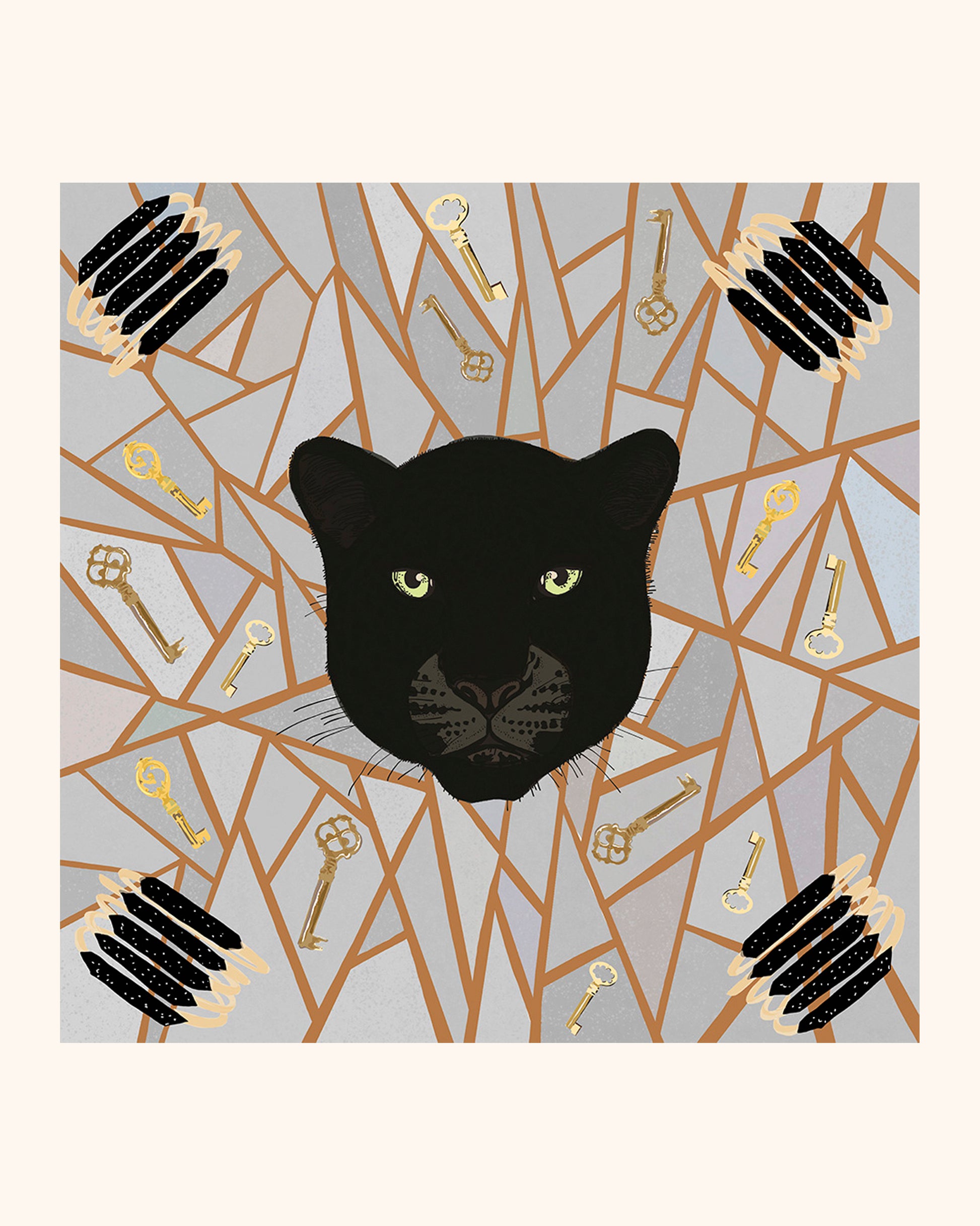 Accesorio atemporal con motivos de pumas como fantasmas de la selva que prefieren vivir en solitario, simbolizado a a través de llaves antiguas que abren sus escondites durante la noche, el pañuelo 90 es un indispensable que se puede llevar tanto en el cuello,como turbante, como cinturón o cinta para el cabello.