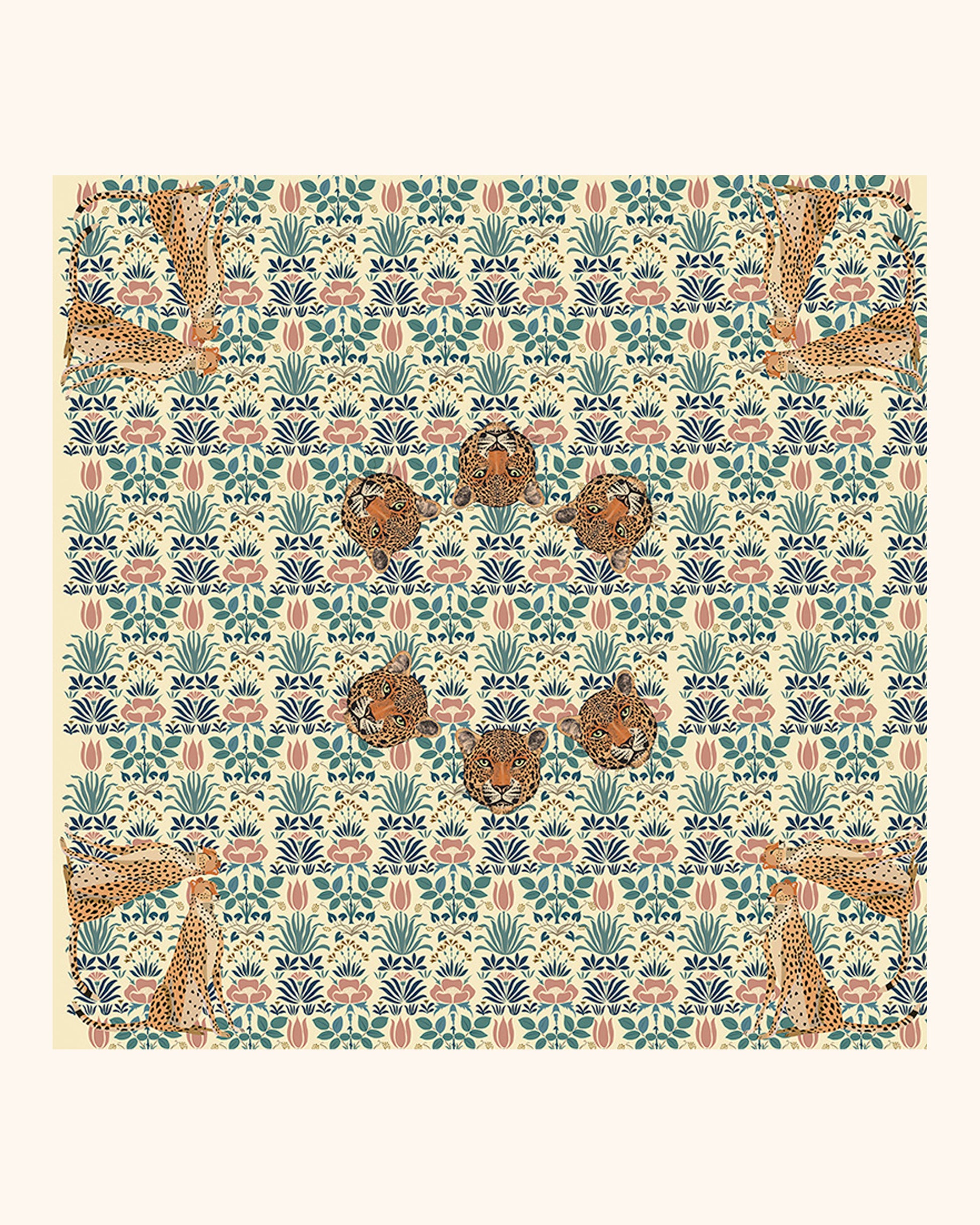 Accesorio atemporal con motivos de panteras pardas caracterizadas por su rugido vocal en un campo de flores silvestres, el pañuelo 90 es un indispensable que se puede llevar tanto en el cuello,como turbante, como cinturón o cinta para el cabello.