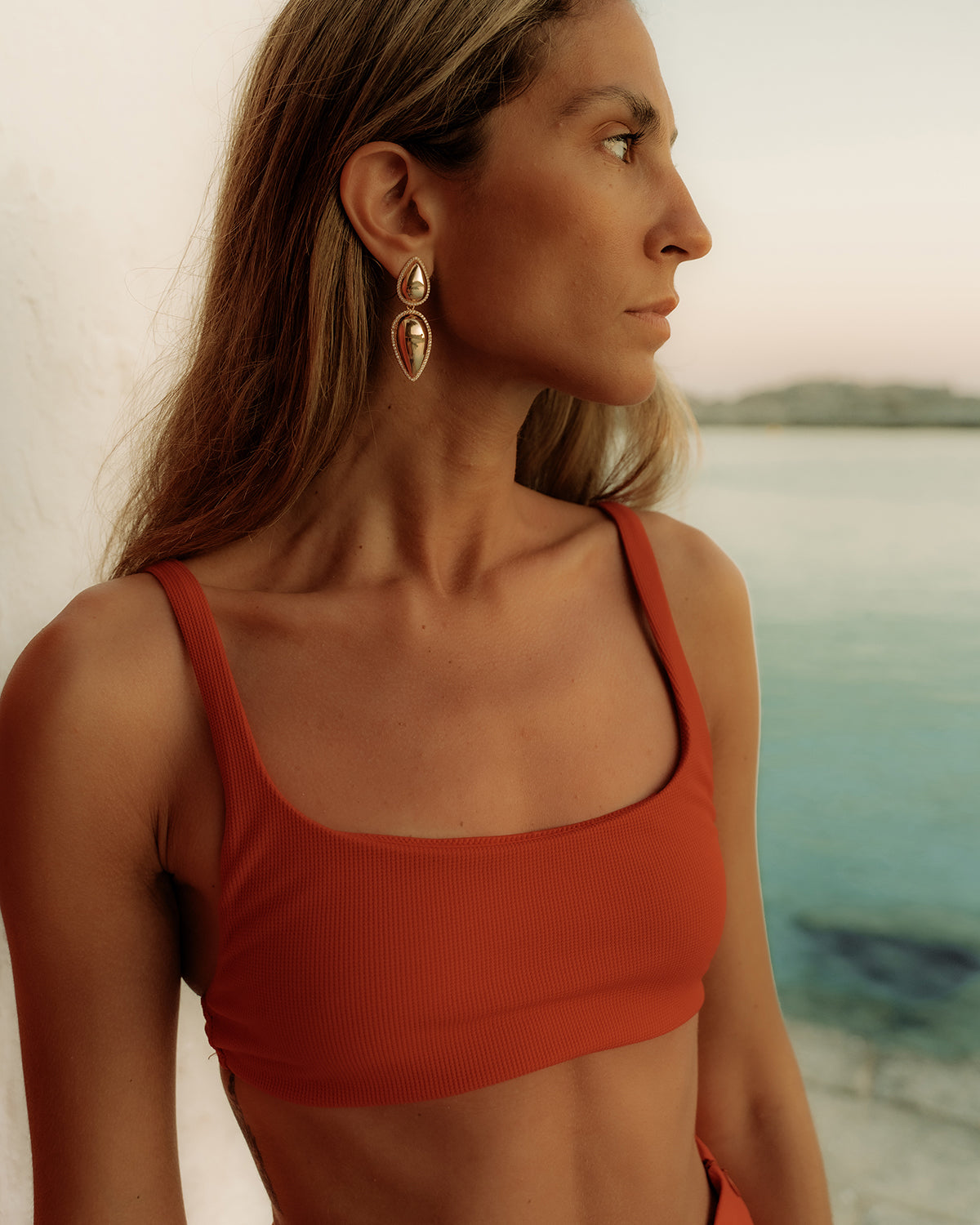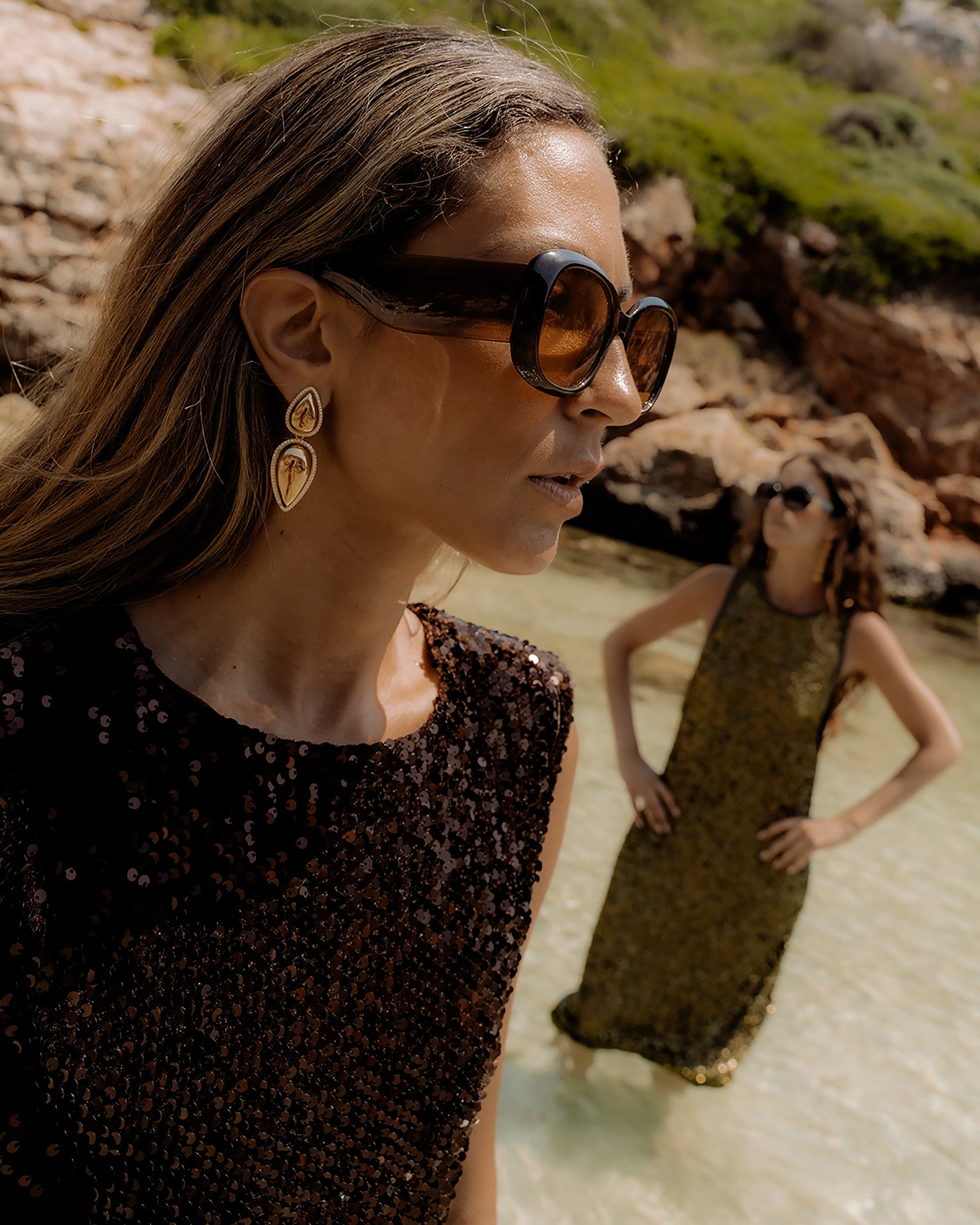 Tip: para un look más luminoso, combina los pendientes con los colgantes Ari en madreperla.