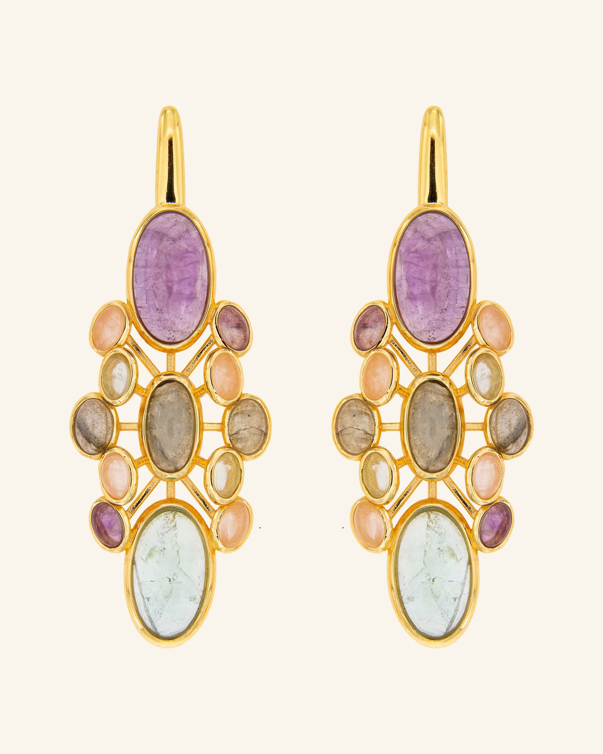 Pendientes en oro champán y piedras naturales en tonos vibrantes combinados con tonos neutro, creando una armonía y una explosión de colores para todos tus looks. Una joya tan elegante como futurista.