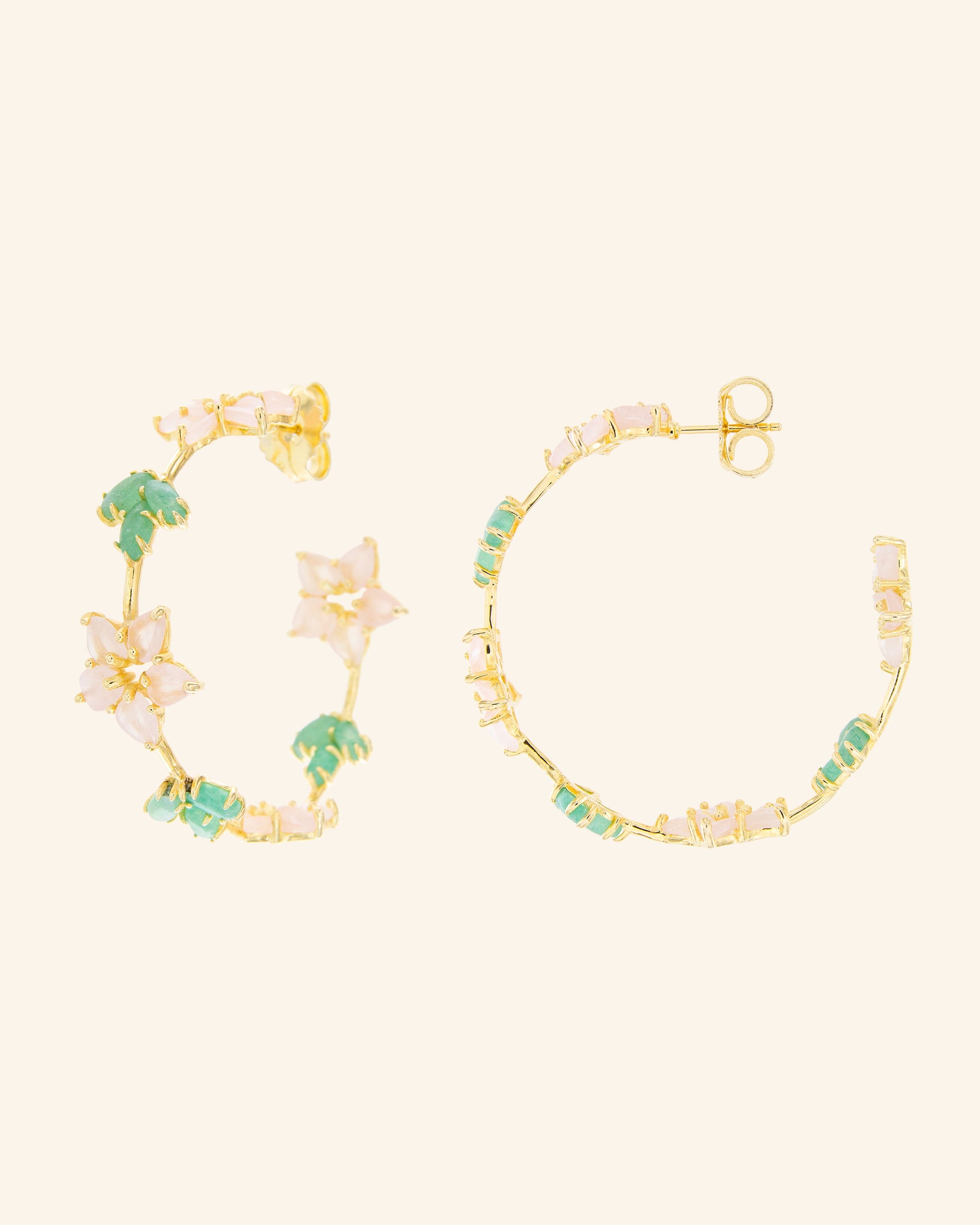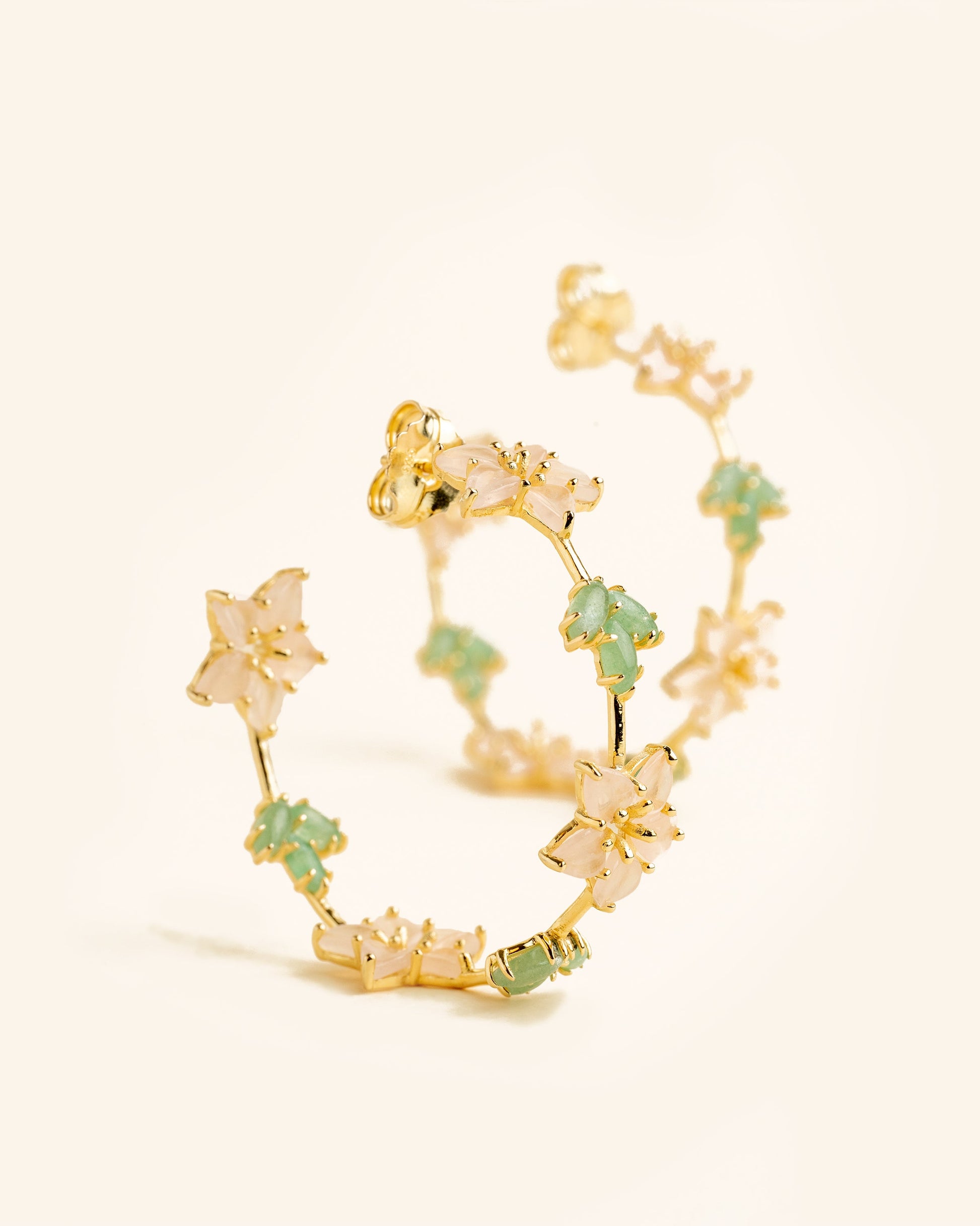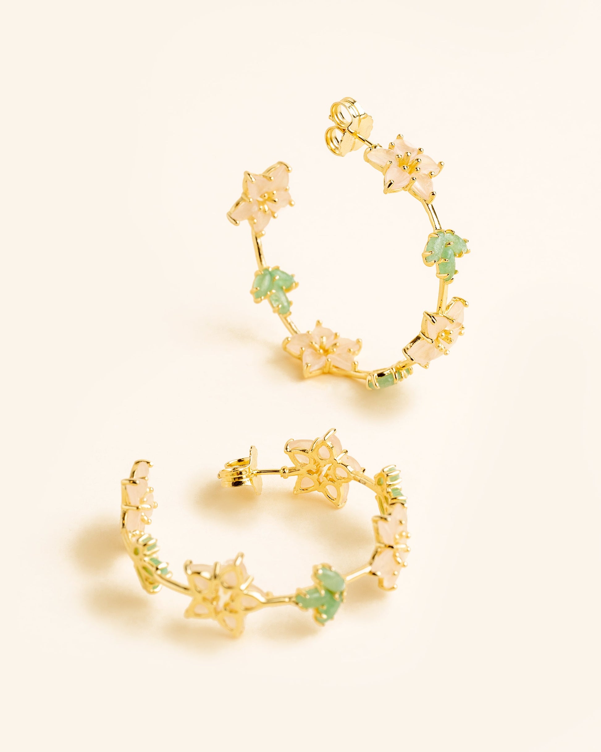Unos aros tan especiales como clásicos. En oro champán y con piedras naturales talladas a mano formando diseños florales inspirados en la flor de Jazmín y su tonos, esta pieza se convertirá en tu favorita para los días más primaverales.